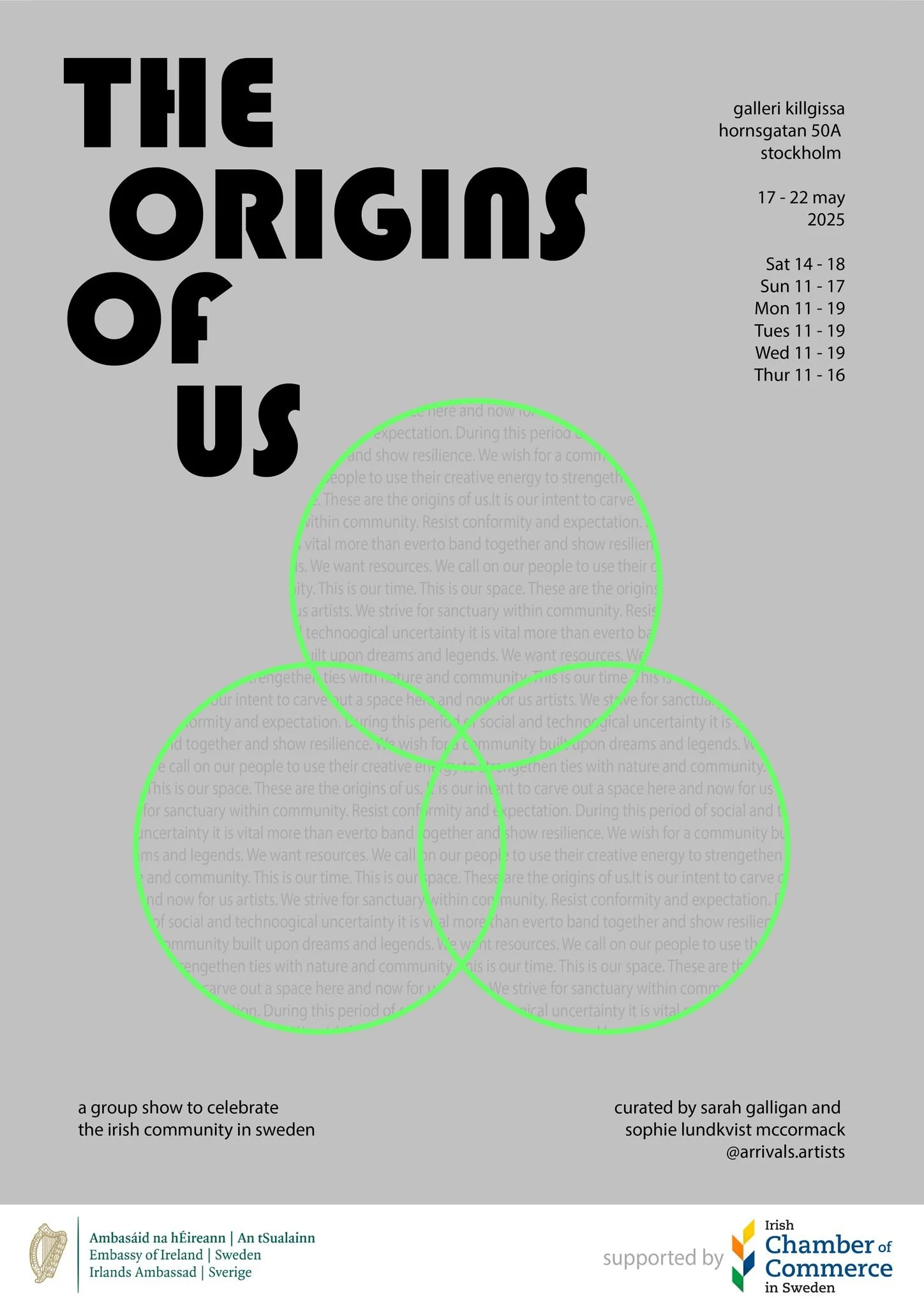 ARRIVALS at Galleri Killgissa The Origins of Us is a group exhibition curated by Sarah Galligan and Sophie Lundkvist-McCormack. Irish artists in Sweden exhibit at Galleri Killgissa. In collaboration with the Embassy of Ireland Sweden and Irish Chambers of Commerce in Sweden. Opening for the public Saturday 17 May at 2:00 PM - 6:00 PM. The exhibition runs until 22 May. @galleri_killgissa @arrivals.artists
